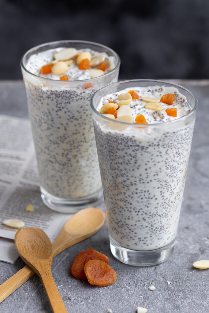 - Meng alle ingrediënten in een groot glas of kommetje. Dek af en laat minstens 1 uur in de koelkast opstijven.