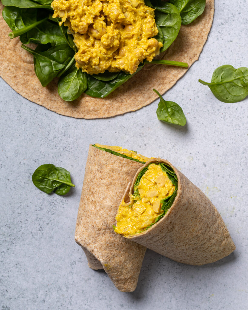3. Serveer de kerriesalade met een handje rucola, veldsla of spinazie op een volkoren wrap, sandwich of roggebrood.