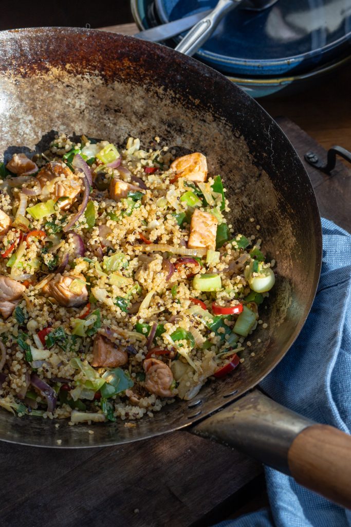 De naam zegt het al: dit wokgerecht staat in een handomdraai op tafel, door te kiezen voor voorgekookte quinoa. Heb je meer tijd of wil je geld besparen? Dan kun je uiteraard ook de quinoa zelf koken. Maak dan eventueel wat extra voor een groentebowl de volgende dag.
