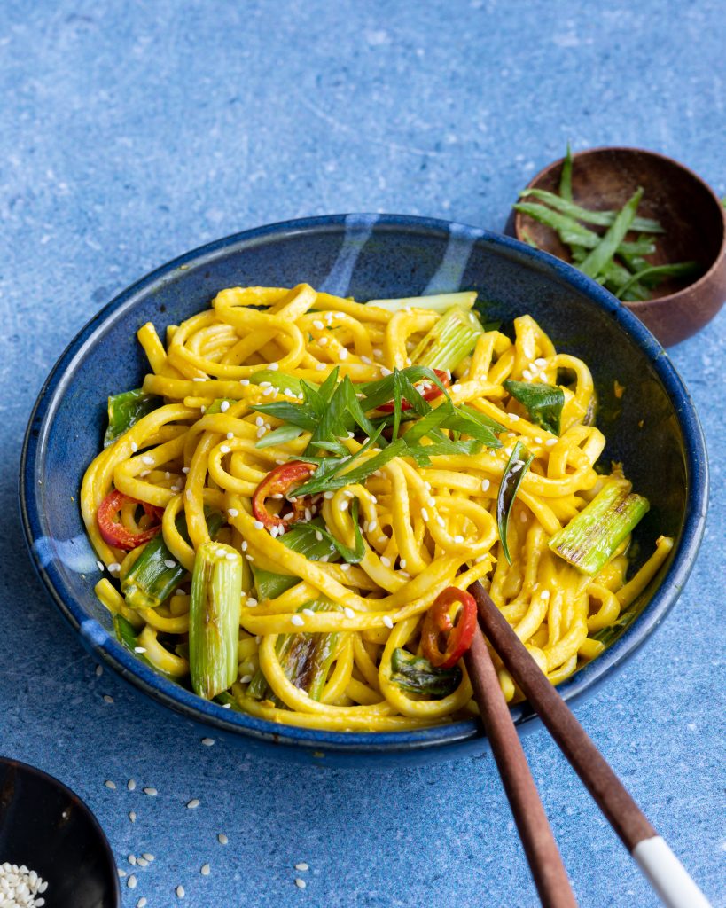 Het kost je slechts een paar minuten meer dan een pakje kant-en-klaar noedels, maar het resultaat is goud waard. Oké, een beetje figuurlijk gesproken, maar de goudgele saus zou je bijna uit de kom willen lepelen. Wok eventueel sugar snaps mee bij de bosui voor een groenterijkere variant.