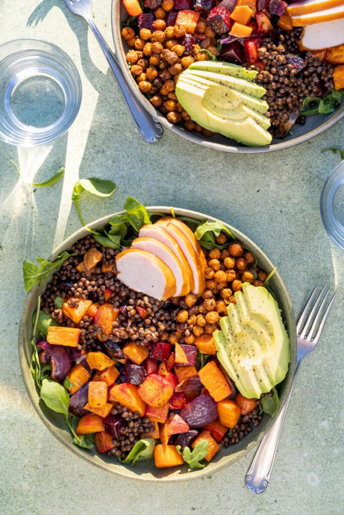 Een kom met deze salade van superfoods barst niet alleen van de smaken en kleuren, maar ook van vezels en gezonde vetten. Laat wel de schil van de groenten zitten en boen ze goed schoon; in die schil zitten de meeste vezels in én het geeft een lekkere bite. Eet je vega? Vervang dan de kip door geitenkaas of walnoten.